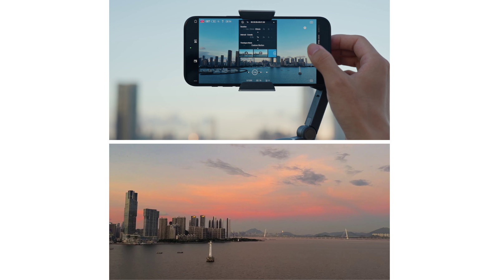 O Osmo Mobile 8 suporta Timelapse, Motionlapse e Hyperlapse, com modelos simples de Motionlapse incorporados para condensar seus momentos de realce em vídeos impressionantes.