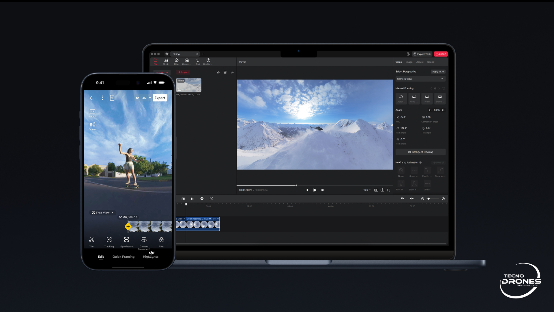 Edite tudo no DJI Fly ou no DJI Studio, com o DJI Studio oferecendo ferramentas avançadas para um fluxo de trabalho fluido. Você também pode criar obras‑primas em 360° diretamente no Premiere com o plug‑in.
