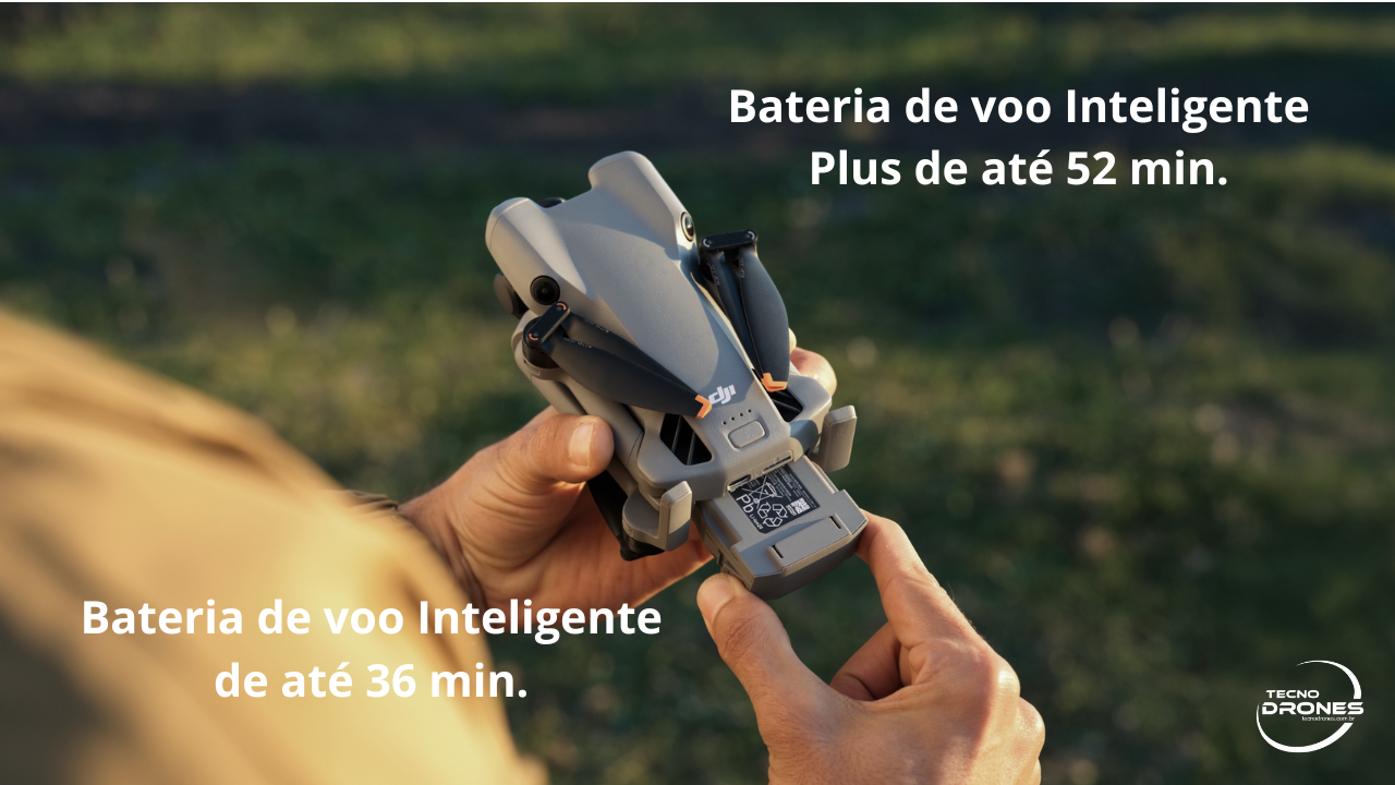 A bateria de voo inteligente oferece até 36 minutos de tempo de voo, enquanto a bateria de voo inteligente Plus oferece até 52 minutos para mais tempo para criatividade. Três baterias de voo inteligente podem ser totalmente carregadas em cerca de 115 minutos, com carregamento rápido para menos tempo de inatividade.