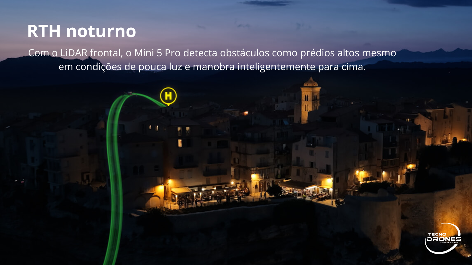 O Drone Dji Mini 5 Pro possui um LiDAR frontal e múltiplos sensores de visão para detecção de obstáculos omnidirecional noturna, tornando o Voltar à posição inicial mais seguro. Em cenários noturnos urbanos, ele detecta e evita ativamente obstáculos ao longo das rotas de voo e retorno para voos noturnos sem preocupações. Com luz suficiente, ele pode memorizar rotas de voo, permitindo decolagem e retorno seguros mesmo sem sinal de satélite.